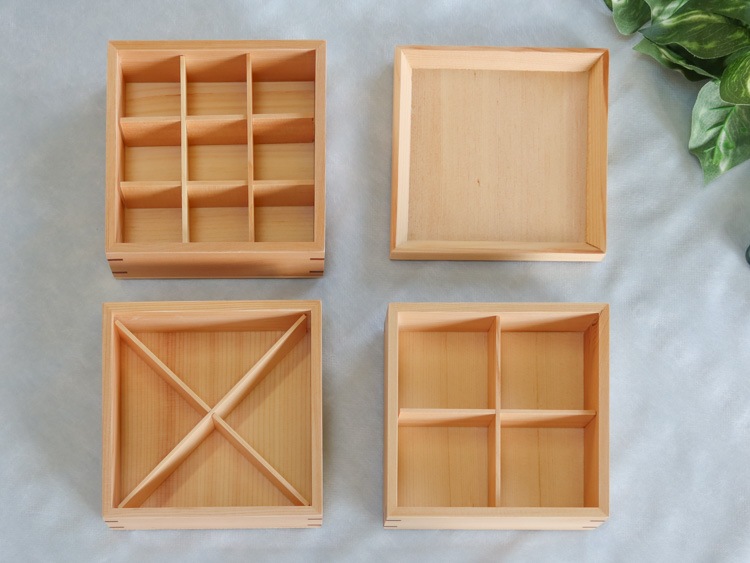 中の仕切りは、4つ(正方形)・4つ(ななめ)・9つに仕切れるようになっています。