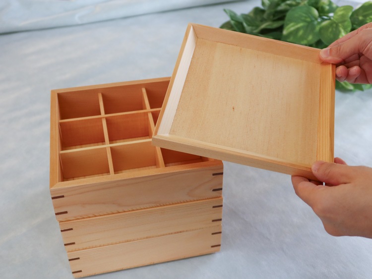 まげわっぱやおひつでもお馴染み、杉の木でできた三段重箱です。