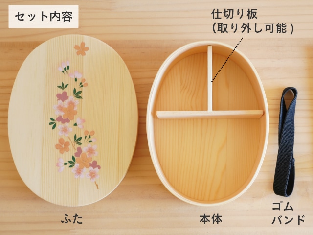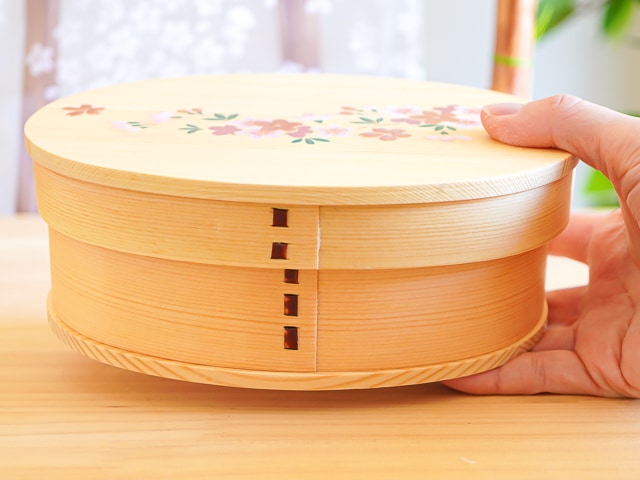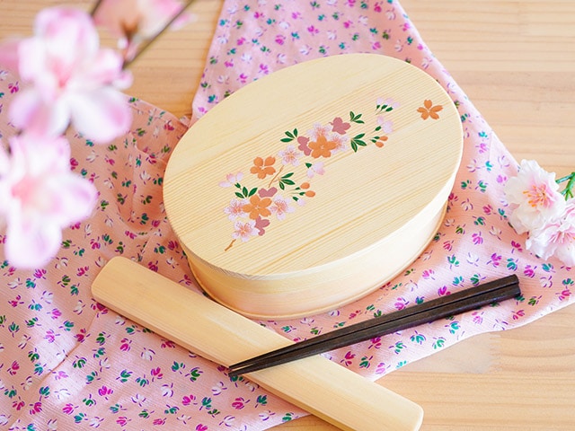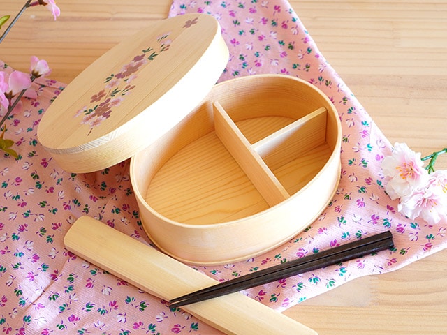 どんなおかずにもよく合うナチュラルな色味の曲げわっぱに、上品な蒔絵の桜模様が描かれています。