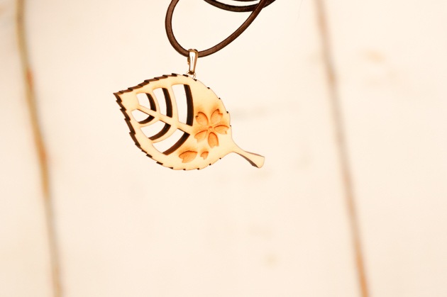 こちらは、桜の葉っぱの形のネックレスに、かわいらしい桜の花を彫りつけたデザインです。 -