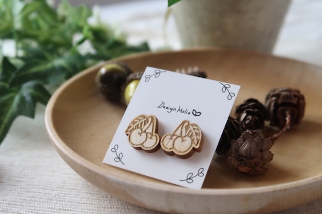 さくらんぼをかたどった木製イヤーアクセサリー。