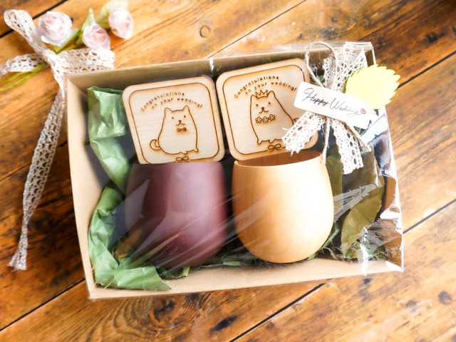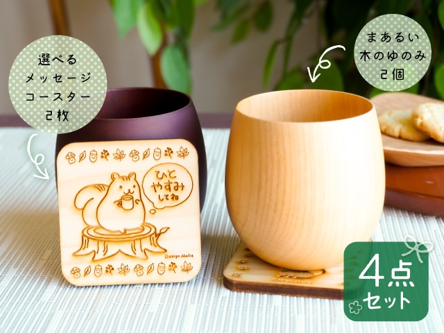 【ラッピング込み】感謝・お祝いの贈り物に 木の湯のみとメッセージコースター ペアギフトセット