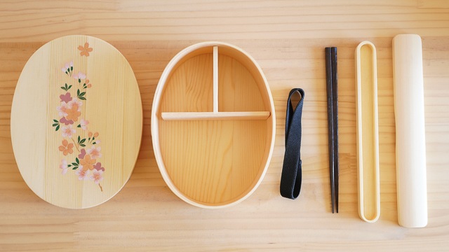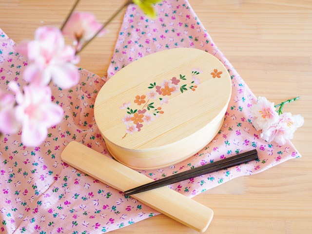 どんなおかずにもよく合うナチュラルな色味・蒔絵のような華やかで愛らしい桜模様が美しい曲げわっぱと、木のお箸・箸箱もついたお弁当ギフトセットです。