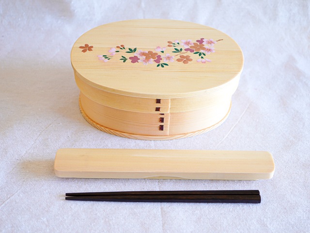 蒔絵の桜柄曲げわっぱのお弁当箱とはし箱&お箸のセット