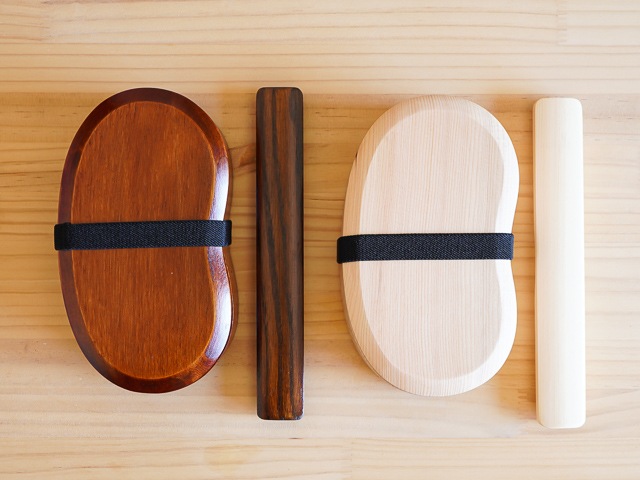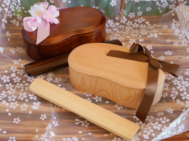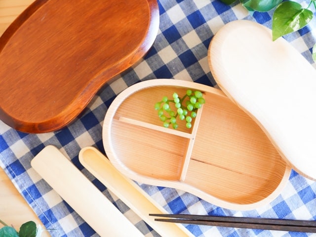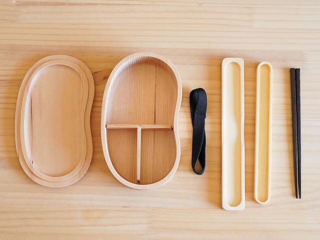 杉の木をくりぬいて作られた、可愛らしいお豆の形のお弁当箱と、木のお箸・はし箱もついたお弁当ギフト3点セットです。