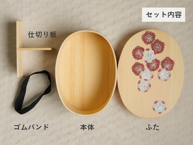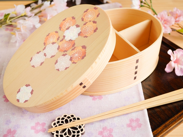 シンプルな曲げわっぱに映える蒔絵がお弁当箱に彩りをそえてくれます。