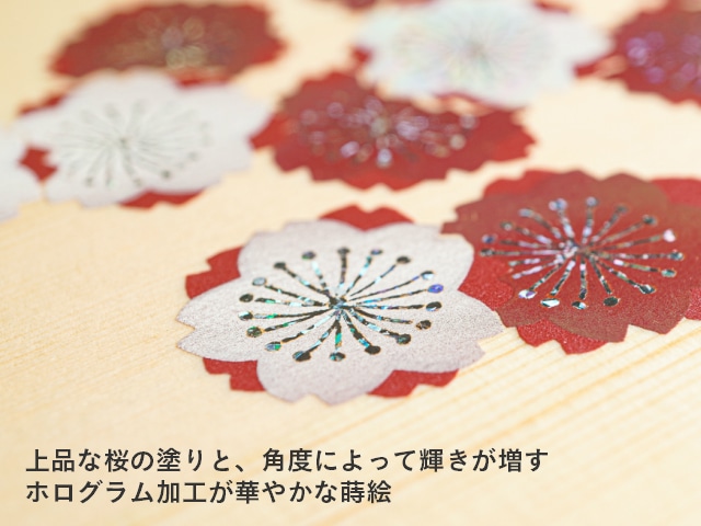 フタに描かれた2色の桜はホログラム加工が施されており、角度によって輝きが変わります。塗りの部分はオーロラのような品のある光沢があり、美しい蒔絵に思わずみとれてしまいます。