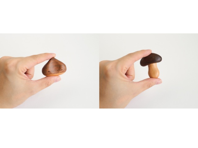 コロンとまるみを帯びた形がかわいく、上下で異なる木の素材を組み合わせてつくられているので、木目の違いや色味の濃淡を楽しむことができます。
