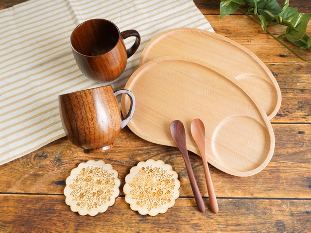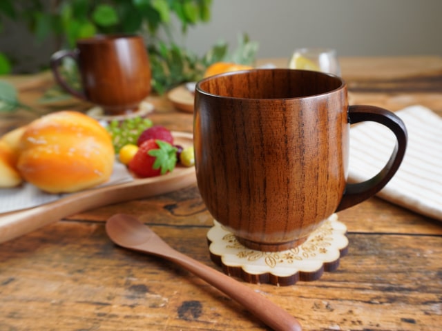 保温性が高く飲み物の温度が変わりにくい、丈夫なナツメの木のマグカップ・コーヒースプーン…2本