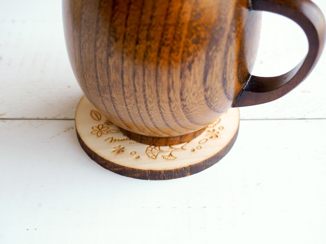 当店オリジナルデザインの天然木エゾ松のコースター。メッセージカード代わりになる華やかで可愛らしいデザインに仕上げました♪