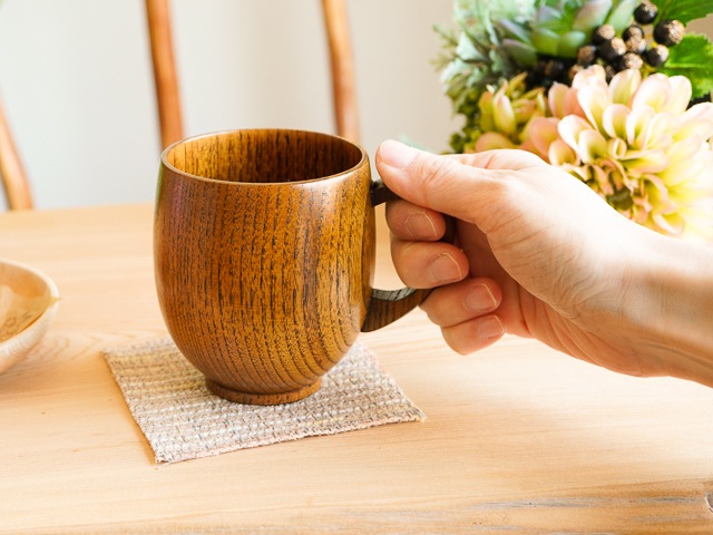 丸っこい形が特徴のこちらのマグカップは、木の材質により保温性が高く、あたたかい飲み物も冷たい飲み物も冷めにくく、ぬるくなりにくくなっています。そのため、季節を問わずご使用いただけます。