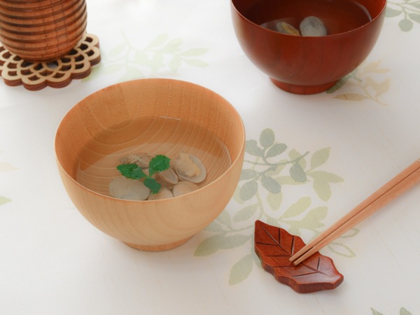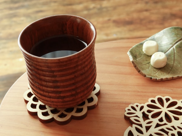 水分に強く頑丈なナツメの木でできたシンプルで使いやすい汁椀は、保温性も高く温かい汁ものに適しています・エゾ松の透かし花コースター…2枚