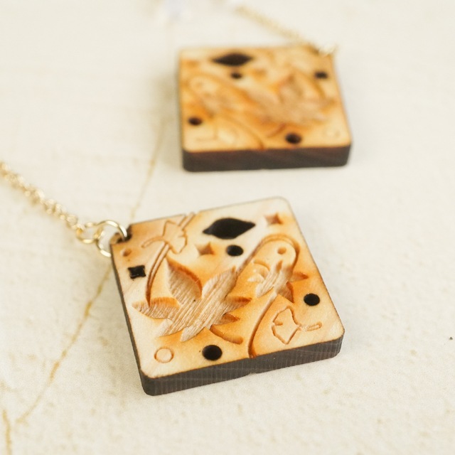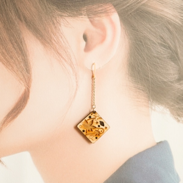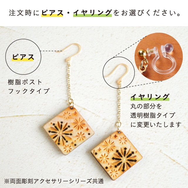耳元でゆれる両面彫刻タイプの木のピアス・イヤリング。